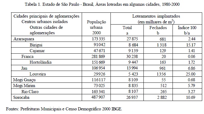 A Tabela 1 apresenta os dados referentes ao peso relativo dos loteamentos fechados no conjunto dos loteamentos implantados em algumas cidades, para que se possa ilustrar a presença dessa nova forma de habitat urbano no território paulista, a partir de alguns exemplos. Nesta tabela, foram incluídas, além de cidades médias (Sorocaba, por exemplo) cidades de porte médio que ampliam suas funções e começam a se definir, também como cidades médias (como Jaú e Franca) ou sedes de municípios que compõem aglomerações urbanas nãometropolitanas (como, por exemplo, Louveira que pertence à aglomeração de Jundiaí). Ainda que este artigo esteja voltado para a análise da redefinição dos conteúdos econômicos e sociais da periferia de cidades médias, temos interesse em mostrar que o fenômeno aparece em cidades de diferentes tamanhos e diferentes papéis, razão pela qual a Tabela 1 foi composta como se segue.