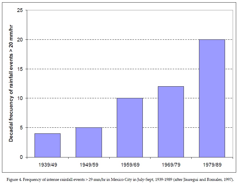 A considerable number of studies have suggested that large urban areas induce changes in rainfall (Kratzer, 1956; Landsberg, 1956, 1970; Chagnon and Huff, 1986). Jáuregui and Romales 1996, have attempted to find evidence of Mexico City urban-induced increases in convective precipitation using daily and seasonal precipitation. In their paper 24-hour isoye-tal analysis showed the existence of not infrequent one or several cells of maximum precipitation located near or downwind of the heat island; moreover, they were able to show that the frequency of intense rain showers (>20 mm/hr) had increased five-fold from 4 per decade in the 1940's to 20 per decade in the 1980's as shown in Figure 4. These authors also found a significant positive trend of the May-October precipitation series for urban station Tacubaya for period 1940-85. However analysis applied to the rest of pluviometric stations in the basin showed trends to be below the 90% level of significance. Therefore in this paper discussion of trend analysis is limited to the maximum/minimum temperatures series showing significant trends above 90%.