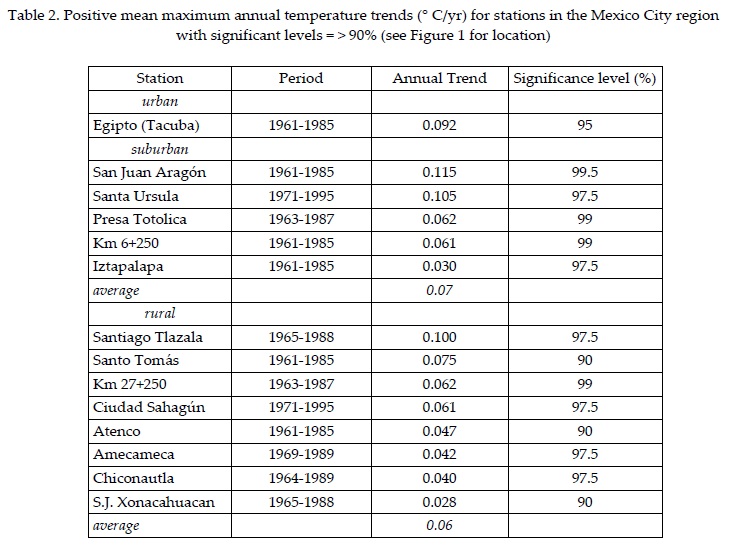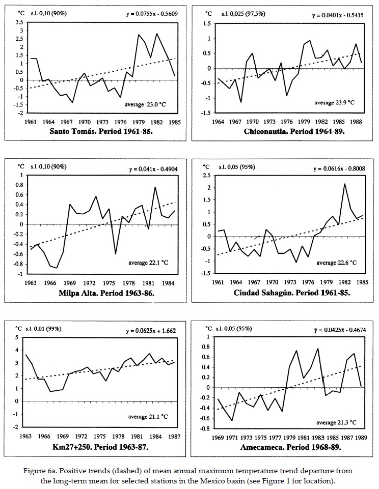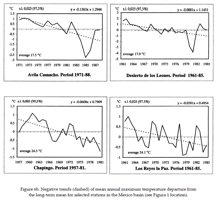 Figure 5 shows distribution of the mean maximum annual temperature trend in the Mexico Basin (° C/century). Afternoon temperatures have increased on the central plains and to the northeast to the east where urbanization is minimal but agricultural activities may have augmented thus turning the albedo of agricultural lands toward higher values during the dry season. A marked area of positive values is centered over Mexico City where the urbanization effect (e.g. heat island) is dominant. The area of negative trend to the east and west of the capital city could be explained by the combined effect of the interception/absorption of solar radiation and increase in albedo of the air pollution layer over the years. Positive decadal variation of mean annual maximum temperature and trend are shown in Figure 6a for selected rural stations on the plains of the Mexico basin and away from the influence of the city, these trends are significant to levels above 90% (see Table 2). Figure 6b shows negative maximum temperature trends for those stations located in the vicinity of the capital city but somewhat distant from the heat island effect and where the smog layer increase in albedo might be dominant (see Figure 1 for location) thus tending to reduce afternoon temperatures.