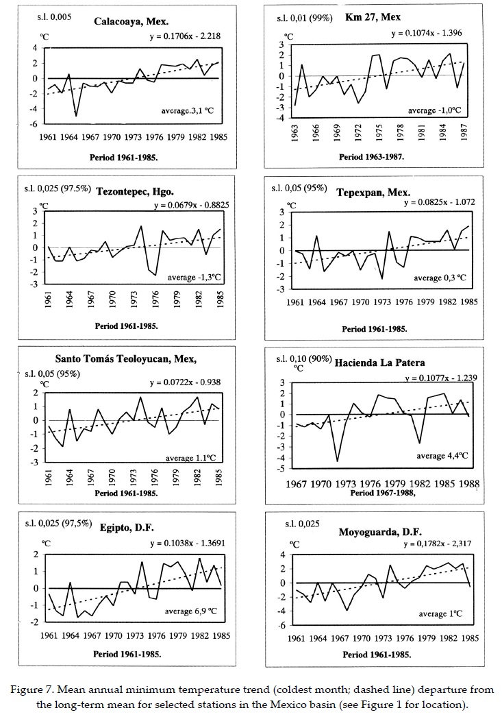 Figure 7 shows interdecadal variability of mean annual minimum temperatures for selected suburban (Tacubaya)/rural stations in the basin (see Figure 1 for location). All stations (8) show a positive trend (significant level >95%) suggesting that morning temperatures are getting warmer not only in the realm of the large metropolis (due to the urban heat island) e. g. urban /suburban stations Egipto, Moyoguarda and Calacoaya) but also in the rural areas surrounding the capital city (Table 3) due to the increasing absorption of outgoing long wave radiation of the surface by the smog layer, which has become denser over the years. While the Tmin trend for the suburban stations (3) shows an average of 0.15° C/yr that corresponding to the rural sites is considerably lower: 0.08° C/yr. The area average maximum temperature trend for suburban stations (6) is 0.07° C/yr while that corresponding to the rural areas (represented by 8 stations) is slightly lower: 0.06° C/yr (see Table 2). The area-averaged minimum temperature increase for all stations was 0.11° C/yr.