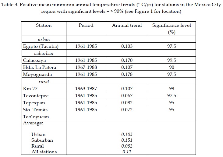 It is well established that anthropogenic land-use changes directly affect the atmospheric boundary layer at the mesoscale dimensions. Located in the high lands of Central Mexico, the basin of Mexico (7 500 km2) has undergone a widespread conversion of natural vegetation to urban and agricultural land by deforestation. While the urban extension of the capital city occupied 6% of the basin in 1960, at the end of the twentieth century the urban sprawl had increased considerably to 20% of the total area. This phenomenal growth has impacted on the thermal climate of substantial portions of the basin. In this paper using annual temperature and precipitation data for a 25 year period, an attempt is made to identify interdecadal climate changes. Results show that large areas of the basin have changed toward a warmer drier climate. While afternoon temperatures have increased at a rate of 0.07° C/yr in the suburbs of the city the corresponding area averaged value for the rural sites is somewhat less: 0.06° C/yr. The afternoon temperature increase for the total number of stations used was 0.06° C/yr. The area-averaged minimum temperature increase in suburban stations (3) was 0.15° C/yr while that corresponding to surrounding rural sites was 0.08° C/yr for period 1961-1985.