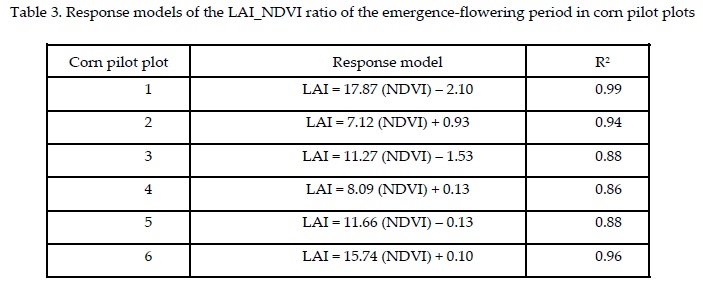 The LAI:NDVI ratio for the emergence period to the flowering period for each of the pilot plots is shown in Table 3. The linear regression models obtained for each plot showed adjusted R2 values ranging from 0.86 to 0.99, which indicates a high correlation between LAI and NDVI. These two variables are related to plant vigour status and the production of biomass of the plants.