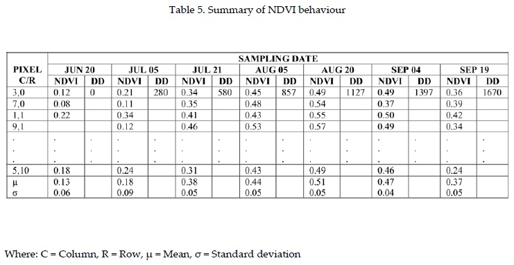 Table 5 summarizes the NDVI behaviour of 20% of the pixels from the total of 144 that comprised the area under study, by reporting the NDVI obtained in the sampled pixels and DDs accumulated at six dates occurring after June 20. These data show that the average NDVI values for each of the dates follow a normal distribution and that the maximum response occurred on August 20, coinciding with the crop flowering stage. The greatest variation occurred on July 5 (a = 0.09). It is possible that this coverage reflectance variation was caused by the dynamics of crop growth and development, as well as by soil humidity and environmental interferences.
