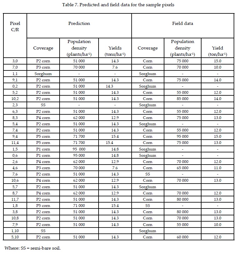 Predictions for determining the type of coverage for corn, sorghum, and semi-bare soil showed a 69% effectiveness when compared with coverage type observed in the field. That is, 20 out of 29 pixels coincided with the prediction. Bearing in mind the high degree of heterogeneity of actual corn conditions in the plots, which is characteristic of corn growing conditions and agricultural management in central Mexico, the accuracy of the obtained prediction is considered good.