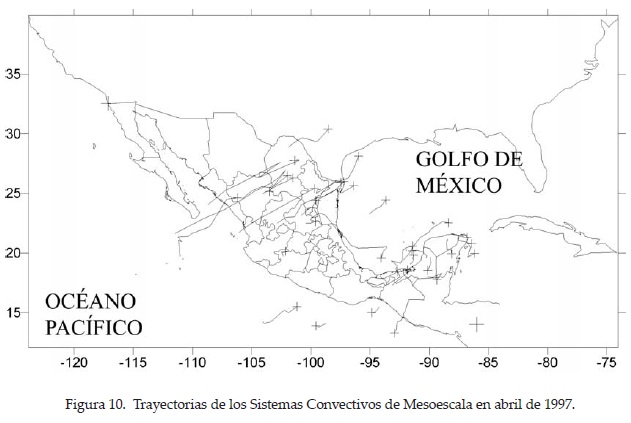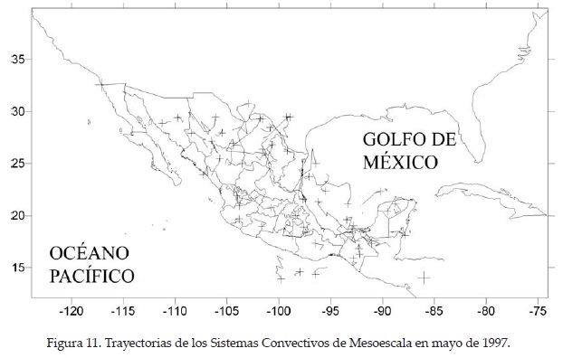 En agosto de 1997 se presentaron 114 SCM en el territorio nacional, especialmente en el noroeste del país, donde la mayoría de ellos se concentra en la parte sur del Golfo de California y tienen una trayectoria paralela a la línea de costa; aunque algunos se mueven hacia el oeste, en forma perpendicular a ella (Figura 14). En contraste, en el noreste del país, casi ningún sistema se presentó, coincidiendo con la canícula, ya que es la región y la época del año donde este fenómeno es más intenso (Ibid.). Otras zonas con una alta frecuencia de SCM, son la parte occidental de la península de Yucatán, debido probablemente al paso de ondas tropicales y sus interacciones con circulaciones locales como brisas marinas en esta región y el Istmo de Tehuantepec, quizás asociados al paso de ondas tropicales sobre las montañas de Chiapas y Guatemala. Hay otra zona de formación en el occidente del país, frente a las costas de Guerrero, Michoacán y Jalisco, debido al paso de SCM asociados a ciclones tropicales.
