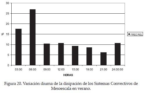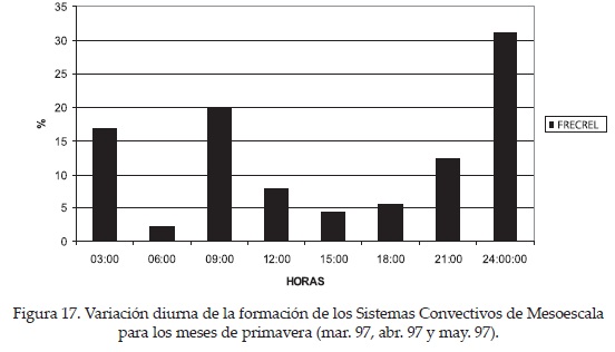 Durante el invierno (dic. 96, ene. 97, feb. 97), los SCM se iniciaron al anochecer (0:003:00 Z; Figura 15) y terminaron principalmente al amanecer (12:00-15:00Z; Figura 16), pero tienen una duración promedio de seis horas, indicando poca influencia de circulaciones locales. Por otro lado, en primavera (mar. 97, abr. 97 y may. 97), los SCM comienzan un poco más temprano, por la tarde (21:00-0:00 Z; Figura 17) y terminan tanto en la mañana (15:00-18:00 Z) como en el atardecer (Figura 18), indicando una creciente influencia del calentamiento diurno en su formación. La duración promedio estacional es de seis horas. En el verano (jun. 97, jul. 97, ago. 97), los SCM empiezan por la tarde (21:00-0:00 Z; Figura 19) y terminan cerca de la medianoche (3:00-6:00 Z; Figura 20), lo que indica una marcada influencia de fenómenos meteorológicos de meso-escala. Durante esta estación, los SCM tienen una duración promedio de seis horas. Finalmente, en el otoño (sep. 96, oct. 96 y nov. 96), los SCM inician su desarrollo más tarde que durante el verano (0:00-3:00 Z; Figura 21) y terminan mayormente cerca de la medianoche (3:00-6:00Z), aunque también en otras horas del día (Figura 22). La duración promedio de los SCM en esta estación es de diez horas, lo que representa el mayor periodo de vida de los SCM de todas las estaciones, probablemente debido a que están asociados a fenómenos meteorológicos de escala sinóptica como ciclones tropicales y frentes fríos.