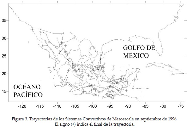 En septiembre de 1996, la frecuencia de SCM fue de 65 (Figura 3), cuatro zonas presentaron un mayor número de sistemas: sur de Sinaloa y Nayarit, en donde los sistemas se desplazaron preferentemente a lo largo de la línea de costa; frente a la costa del Pacífico Sur, con trayectorias relativamente largas y movimiento hacia el oeste; el sur de Tamaulipas y norte de Veracruz (cuenca del Pánuco) y sur del Golfo, en estas dos últimas zonas, los SCM siguieron trayectorias variables. El patrón de distribución de los SCM coincide con la fase de retiro del monzón sobre el noroeste (Douglas y Li, 1993), cuando la actividad convectiva se desplaza hacia el este y sur de la región (Cortéz, 2000).