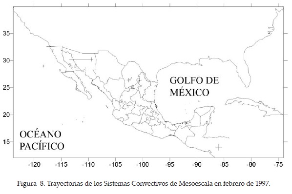 En diciembre de 1996 se identificaron diez sistemas, algunos de los cuales se desarrollaron en el noroeste de México y mostraron un movimiento hacia el este. Un aspecto interesante durante este mes es la formación de algunos sistemas en el Pacífico nororiental, los cuales siguieron una trayectoria nornoreste y penetraron al país en la parte centro-occidente (Figura 6), lo cual sugiere la influencia de la corriente en chorro subtropical, en el transporte de humedad hacia el interior del país. En enero de 1997 se presentaron sólo cinco SCM, principalmente en el norte de México, los sistemas mostraron un movimiento hacia el noreste (Figura 7). En febrero de 1997 se presentó un patrón muy semejante al de enero, con cinco sistemas identificados (Figura 8). En marzo de 1997 se tuvo un ligero incremento en el número de SCM, con respecto a los dos meses anteriores, contabilizándose un total de ocho sistemas, los cuales se concentraron en el noreste del país (Figura 9), lo que coincide con el inicio de la temporada de SCM en Texas (Hashem, 1997).