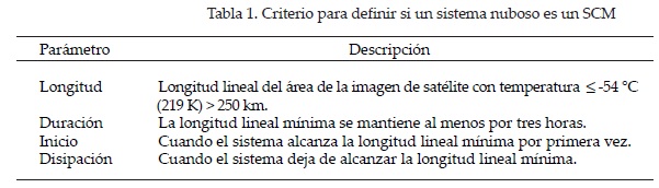 Para determinar si un sistema nuboso era un SCM, se estableció un criterio basado en imágenes de satélite parecido al que usaron Bartels et al. (1984) en la parte central de Estados Unidos (Tabla 1).
