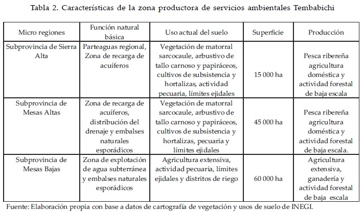 Maraver y Romero (1992) realizaron, por parte del Consejo de Recursos Minerales, un estudio geológico y evaluativo del proyecto determinando, de manera preliminar, las reservas potenciales del prospecto. Actualmente, Roca Fosfórica Mexicana S. A. de C. V. (ROFOMEX) realiza trabajos evaluativos en el área. Existe además la cartografía geológica-minera escala 1:250 000 y 1:50 000 elaborada por el Consejo de Recursos Minerales en 1999. El área de Tembabichi está constituida por rocas intrusivas, extrusivas y sedimentarias. Se han identificado cinco capas de fosfato, siendo la capa 3 la de mayor interés en el depósito, por su longitud, espesor y ley. Ésta se ha seguido por más de 21 km de norte a sur del depósito, en afloramientos discontinuos y espesores que varían de 1.0 a 4.90 m. Las capas de fosfato presentan inclinaciones de 2 a 6° al SW en algunos lugares y al NW en otros, según sea el buzamiento de los estratos de la Formación San Gregorio. Las características geoeconómicas (Tabla 2) descritas, convierten a esta región en una zona productora ambiental potencial, la cual está constituida por micro regiones dentro de su área de influencia con funciones naturales básicas que permiten establecer usos del suelo de baja intensidad en un medio natural-rural.
