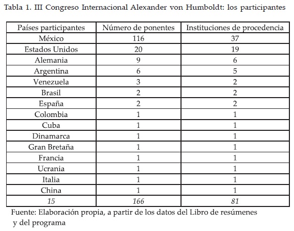 Las mesas de trabajo dedicadas al viajero, que da nombre a este evento, no podían faltar. Especialistas de Alemania (5), México (4), Estados Unidos (3) y Venezuela (1) analizaron su personalidad, sus travesías por América y Europa, sus obras y su discurso. En general, los estudios se enfocaron en las descripciones que Humboldt hizo de los lugares que visitó en América y en sus narraciones; la mayoría se refirieron a su estancia en la Nueva España. Algunos de estos ponentes como Walter Bernecker, Oliver Lubrich, Ulrike Leitner y Richard Weiner habían presentado trabajos del mismo tono en el congreso anterior, lo que evidencia una continuidad en las investigaciones y en las temáticas de los congresos.