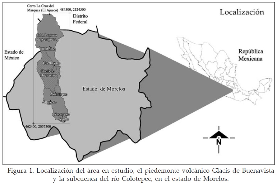 El Glacís de Buenavista es un piedemonte volcánico que se localiza en la parte media de la subcuenca del río Colotepec, la cual pertenece a la cuenca del Río Grande o Amacuzac en la región hidrológica 18 o Balsas (IMTA, 1996). El piedemonte se extiende entre los estados de Morelos y México, pero su mayor extensión (90% de su área total), se localiza en el primer estado (Figura 1). La superficie del piedemonte dentro de la subcuenca tiene una extensión de 20 272 ha (202.7 km²). Sus límites involucran a los municipios de Huitzilac, Cuernavaca, Temixco, Miacatlán y Xochitepec, dentro del estado de Morelos, así como una mínima porción en el municipio de Ocuilán de Arteaga, en el Estado de México. El piedemonte volcánico del Glacís de Buenavista (PMVGB) está formado por un extenso abanico volcánico, identificable con facilidad tanto en fotografías aéreas e imágenes satelitales, como en mapas topográficos (Figura 2). Se localiza en la parte media de la subcuenca y constituye parte de la formación Cuernavaca (Palacio-Prieto, 1982), también conocida como Glacís de Buenavista (Ortiz, 1977). Tiene un origen poligenético asociado a cambios de regímenes climáticos, procesos de gelifracción y de ladera, que se presentaron en el Cuaternario, dentro del área en donde ahora se observan los restos del volcán Zempoala (Palacio-Prieto, 1982; Ortiz, 1977; Mooser et al., 1996).