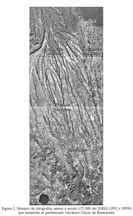 El abanico forma un extenso piedemonte que ocupa un amplio sector de la subcuenca desde los 1 100 a los 2 800 m de altitud. Sin embargo, de acuerdo con Aguilar (1998), sus límites reales van más allá del parteaguas de la subcuenca del Colotepec (Figura 1). Dicho autor menciona también que esa estructura volcánico acumulativa queda limitada al poniente por las estribaciones de la sierra de Tejaltepec y por el oriente el Valle de Jiutepec, pero un tercio de su superficie original quedó sepultada por los flujos lávicos producto de las erupciones de varios volcanes pequeños del grupo Chichinautzin, ocurridas en el Holoceno. En esa área algunas estructuras de derrames de flujos basálticos sobreyacen a los materiales del Glacís de Buenavista (op. cit.).