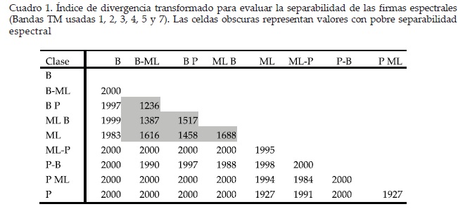 Las firmas espectrales de las áreas de entrenamiento fueron agrupadas mediante el procedimiento "join" de ERDAS para después analizar su separabilidad mediante el índice de la divergencia transformada. Si el índice es mayor a 1 900, entonces las firmas son claramente diferentes, un valor entre 1 700 y 1 900 indica una separabilidad regular, y un índice menor a 1 700 indica una separabilidad pobre (Puncey, 1999).