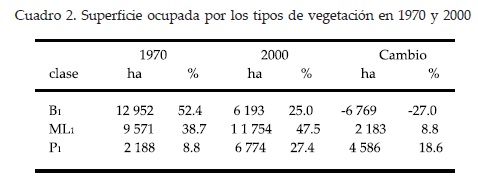 Los cambios en la superficie ocupada por cada tipo de vegetación en el nivel más general se muestran en el Cuadro 2. La superficie arbolada (B) disminuyó en un 27.0%, mientras que la superficie dominada por arbustivas (ML) y la dominada por herbáceas (P), aumentó en un 8.8 y 18.6%, respectivamente.
