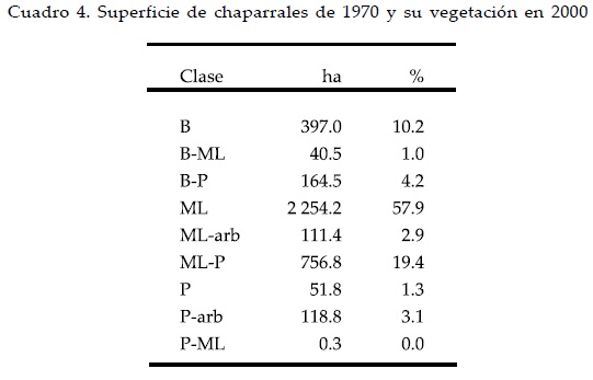 El Cuadro 4 muestra la superficie que en 1970 era de chaparrales y que en el 2000 tiene el mismo u otro tipo de vegetación. Se observa que el 57.9% de los chaparrales continúan siendo chaparrales en 2000, los cambios más importantes fueron hacia chaparral con herbáceas y recuperación hacia bosques (18.9 y 10.2%, respectivamente).