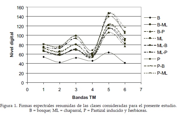 La superficie total analizada después de enmascarar las áreas no relevantes fue de 24 721 ha. Las firmas espectrales de las áreas de entrenamiento para el procedimiento de clasificación supervisada de la imagen se presentan en la Figura 1, en ella se aprecia que la firma espectral de la categoría bosque se distingue claramente de las demás; las clases B-P, B-MLy ML-B se separan únicamente en la banda 7 (infrarrojo medio) aunque generalmente esta banda no se usa para distinguir vegetación. Las categorías ML y P-B presentan prácticamente los mismos niveles digitales en todas las bandas. Las categorías P, ML-P y P-ML presentan los mayores niveles de reflectancia y tienen una mejor separabilidad entre ellas. Este resultado se refleja también en el índice de divergencia transformada, el cual presenta para estos casos valores inferiores a 1 700 (Cuadro 1). Esta confusión no fue posible subsanarla dado que en el campo se trata de vegetación con diferentes grados de cobertura entre elementos arbóreos, arbustivos y herbáceos, derivada de la heterogeneidad del paisaje.