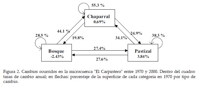 En la Figura 2 se presentan las tasas de cambio anual, así como los porcentajes de la superficie de 1970 que cambió o que continuó en la misma clase. El 28.5% de la superficie arbolada de 1970 persistió en el 2000, el 44.1% se transformó en superficie dominada por arbustivas y 27.4% cambió a superficie dominada por herbáceas. De los chaparrales, 55.3% continuaron como chaparrales, el 19.8% se recuperó hacia bosques y el 24.9% se degradó a herbáceas. Por último, de la superficie dominada por herbáceas, 38.3% continuó en esta categoría, mientras que el 34.1% cambió hacia chaparrales y un 27.6% a superficie dominada por arbóreas.