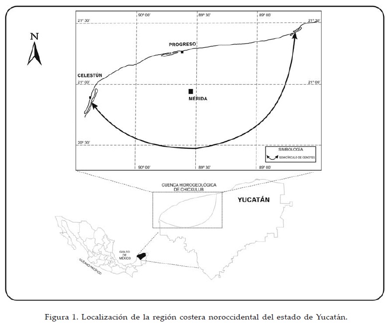 El área en estudio se localiza en la costa noroccidental de la península de Yucatán. El área total que ocupa es de 3 198 km2 e incluye principalmente los municipios de Celestún, Hunucmá, Progreso de Castro y Mérida, pertenecientes al estado de Yucatán. Se encuentran también representadas dos áreas naturales protegidas: Reserva de la Biosfera de Ría Celestún y la Reserva Estatal de El Palmar, que en conjunto abarcan 1 092 km2 (Figura 1).
