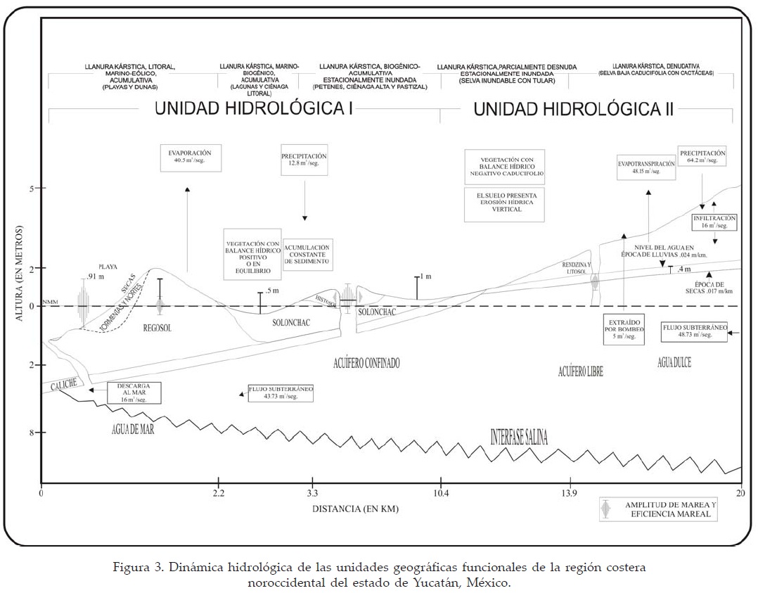 Por su dinámica hidrológica superficial, relacionada con las fluctuaciones estacionales del nivel de agua, se observa una fuerte asociación entre la unidad geográfica de segundo orden D y C (Tabla 1), donde los valores máximos de inundación de estas unidades se presentan de junio a noviembre y no sobrepasaron la isolínea de altitud de 1.0 msnm. Se caracterizan por sus aguas salobres y dulces, temperaturas bajas y una dinámica independiente de la marea, excepto en los manantiales y cenotes. Se definen como áreas palustres. La unidad B se caracteriza por presentar la máxima inundación de octubre a febrero, asociada al incremento del nivel del mar y con características salobres a salinas. En las lagunas y ciénagas con contacto permanente con el mar, el nivel de agua oscila en relación con la marea y presentan variaciones de salinidad muy marcadas. Se definen como áreas estuarinas. En general, el extremo oriental del área (incluyendo las unidades B, C, D y E) se constituye como una zona hipersalina y sobrecalentada, mientras que el extremo occidental se constituye como una zona salobre y templada.