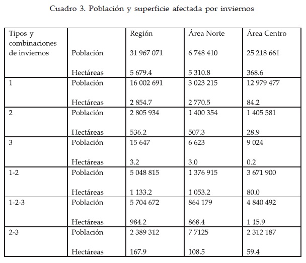 La población total afectada por inviernos tipos 1 y 3 es más numerosa en el área centro y el tipo 2 afecta mayormente al área norte. Por lo que respecta a la superficie involucrada por el invierno tipo 1, ésta es mayor en el área norte y los tipos 2 y 3 territorialmente tienen mayor presencia en el área centro (Figura 6).