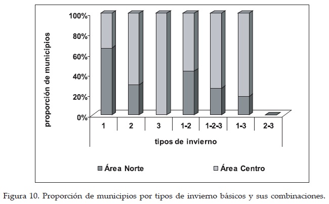 El objetivo de este apartado es revisar la distribución y características de la población que habita las áreas del norte y centro de México con inviernos fríos en los tipos básicos y las categorías mencionadas. El número de municipios que conforman las dos áreas se sitúa en espacios territoriales con diversas características de altitud, relieve y orientación, por lo que en algunos de ellos se llegan a presentar varios tipos de inviernos, dando lugar a espacios de inviernos heterogéneos. En la Figura 10 se advierte que en ambas áreas se pueden encontrar estas combinaciones de los tipos básicos de inviernos.