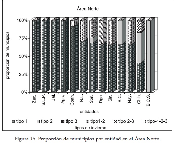 Al analizar por entidad federativa los municipios de Zacatecas, San Luis Potosí, Jalisco y Aguascalientes son afectados por inviernos del tipo 1 solamente; en Coahuila, Nuevo León, Sinaloa y Nayarit, entre el 67 y el 71% de sus municipios es del tipo 1 y el resto comparte espacio con inviernos del tipo 2. En el estado de Durango el 67% se encuentra en el tipo 1 y tiene un 33% con los tres tipos de inviernos. El estado de Baja California también tiene más de 60% de los municipios en el tipo 1 y el resto en el tipo 2. Chihuahua, presenta el 41% en el tipo1, 1% en el tipo 3 y un 15% comparte espacios de los tipos 2 y 3. Y, finalmente, en el estado de Baja California Sur, los municipios son del tipo 2 (Figura 15).