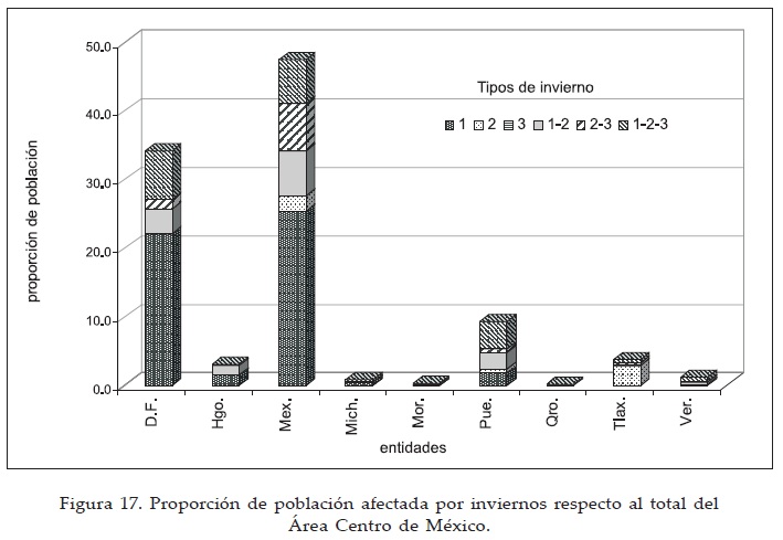 En un análisis por entidad federativa, las mayores concentraciones de población corresponden al invierno tipo 1, caracterizando a Querétaro, Distrito Federal, Michoacán, Estado de México e Hidalgo. El invierno tipo 2 en Tlaxcala. Cabe señalar que existen espacios territoriales en donde la presencia de los tres tipos de inviernos identifica a entidades como Morelos, Puebla y Veracruz (Figura 18).