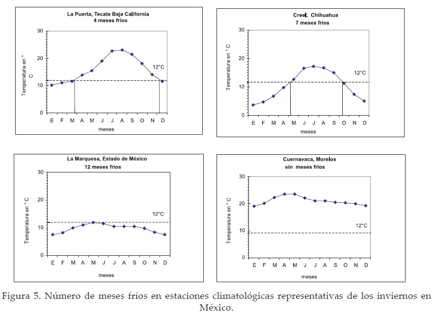 Para establecer el límite superior de temperatura media de un mes invernal frío, se emplea el umbral de 12° C, y para la de muy frío el de 5° C (García y Vidal, 1992). A partir de la información sobre estos rangos de temperatura, se han elaborado gráficas de marcha anual de la temperatura media, que facilitan apreciar los meses fríos en varios sitios del país. La línea punteada en la gráfica representa el umbral térmico de 12° C y se hace referencia al número de meses fríos (Figura 5).
