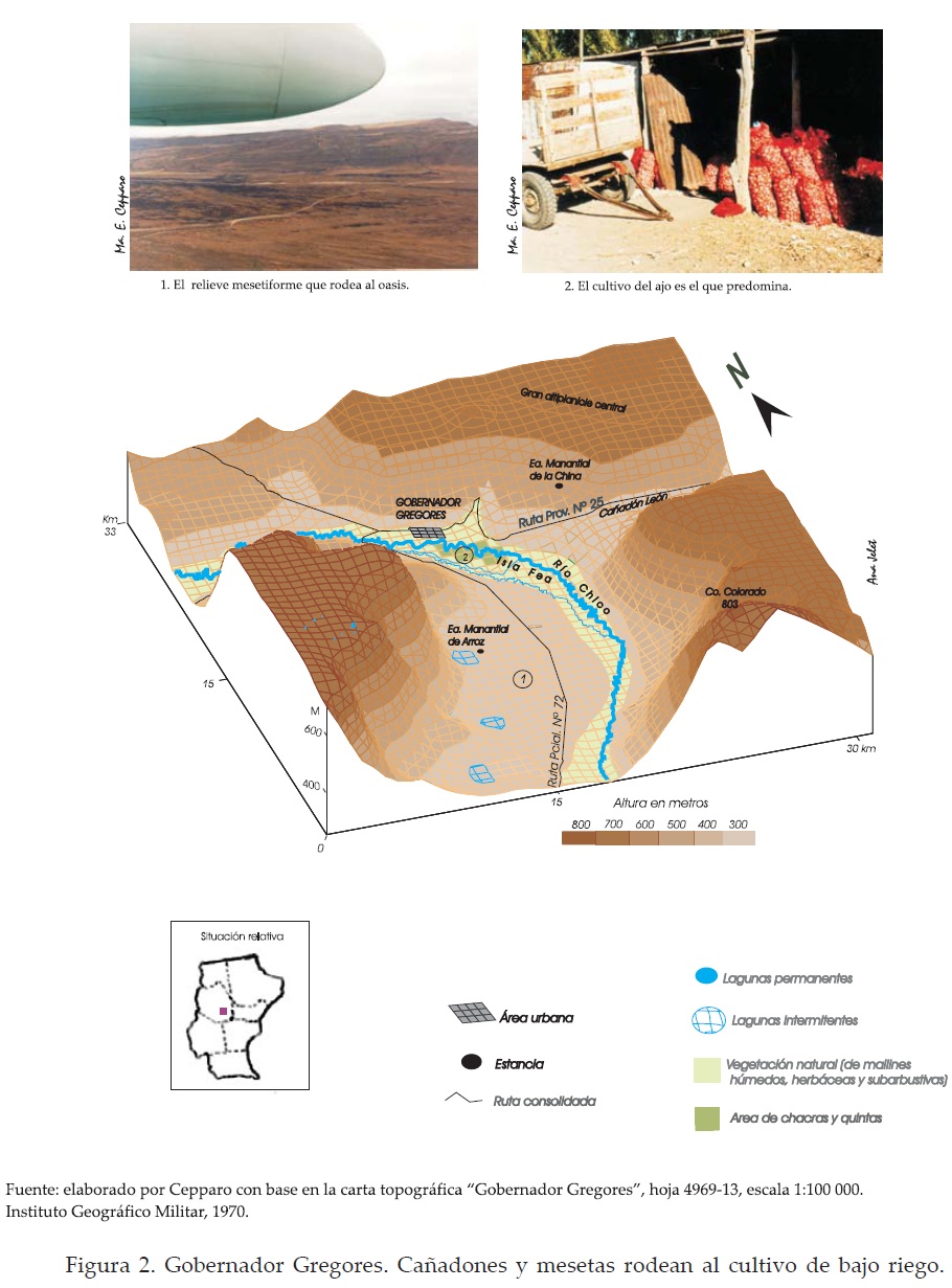 El área cultivada de Gobernador Gregores, en el centro mismo de las mesetas santacruceñas, aprovecha el importante caudal del río Santa Cruz y su confluencia con el río Chico, aunque en una proporción escasa con respecto a lo que podría utilizarse (Figura 2). Desde los inicios del asentamiento, la explotación agrícola se orientó hacia los cultivos de alfalfa y de algunas hortalizas, requeridos por los habitantes de la localidad y por los productores de las explotaciones ganaderas cercanas (Cáceres, 2000:898).