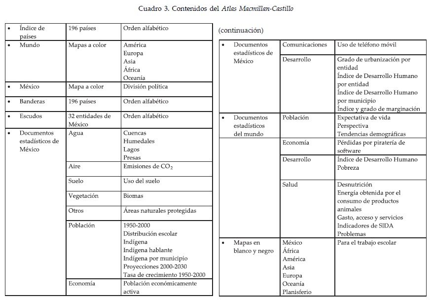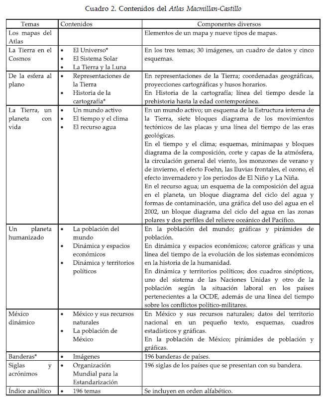 En cuanto a los temas abordados en el Atlas Universal y de México de Macmillan Castillo se observa que no se apegan fielmente al programa de geografía 2006 y se incluyen algunos contenidos ajenos que terminan por configurar una reforma a la reforma educativa. Esto se puede ver en el Cuadro 2 donde se presentan los temas, contenidos y componentes diversos que alternan con los mapas del atlas. En particular se marcan con asterisco los temas fuera de programa.