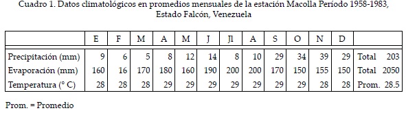 El clima del área, según la clasificación de Köppen es BSh, donde la letra B identifica los climas secos caracterizados por una evaporación superior a la precipitación media anual. La letra S indica un clima semiárido con precipitaciones anuales entre 380 y 700 mm en las latitudes bajas y la letra h significa caluroso y seco con una temperatura media superior a 18° C (Strahler y Strahler, 1996). En La Macolla la evaporación es de 2 050 mm, la precipitación presenta un monto de 203 mm, la temperatura promedio es de 28.5° C y la variación térmica anual oscila entre 1 y 2°, por lo cual se clasifica como un régimen térmico isotérmico (Cuadro 1).
