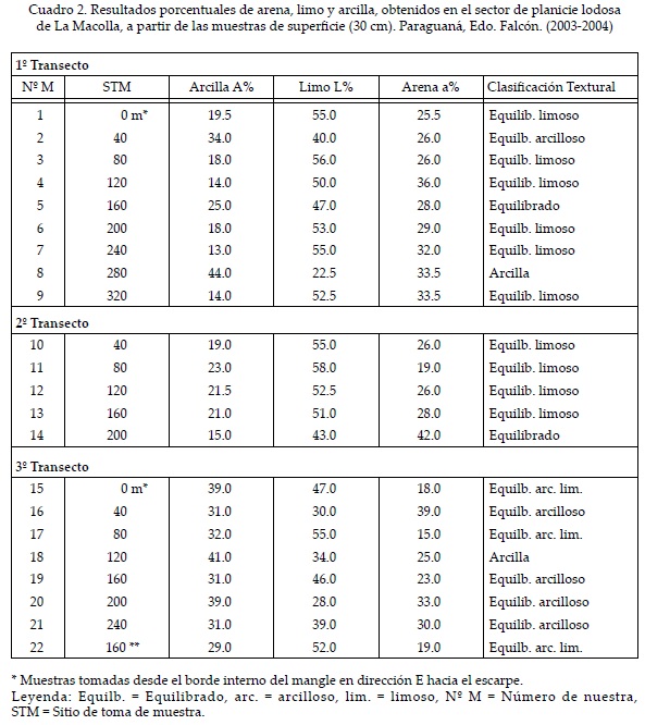 De acuerdo con los resultados del Cuadro 3, la textura de los sedimentos de este sector se caracteriza por ser equilibrada arcillosa a arcillo arenosa, a juzgar por el mayor porcentaje de arcillas y arenas mientras que los limos representan la menor proporción, si utilizamos el triángulo de la Figura 8, la intersección de los valores porcentuales quedaría ubicada en las celdas superior central y superior izquierda que corresponde a la clasificación textural antes enunciada. El contenido de materia orgánica osciló entre 3.09 a 3.15%, considerado un valor medio si se toma en cuenta la textura fina del suelo (Palmaven, 1992). La relación estrecha entre la fracción granulométrica y el contenido de materia orgánica del suelo, ha sido reportado por Pannier y Fraíno de Pannier (1989) y Bird (2000), quienes indican que la implantación de la especie pionera Rhizophora es favorecida en sedimentos con cierto predominio de fracciones arenosas y mayor contenido de materia orgánica.