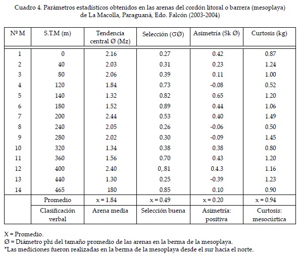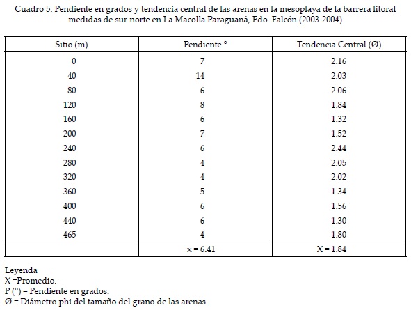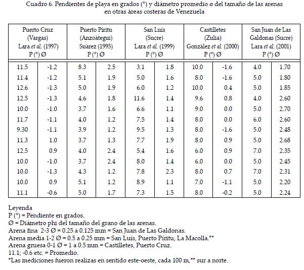 El tamaño promedio de las partículas de arena se indica en el Cuadro 4, el cual revela que el predominio del oleaje cotidiano es de 1.84 Ø, y corresponde a arenas medias, el promedio de la selección es de 0.49 Ø, ubicándola en la categoría de buena, entre 0.35 y 0.50 Ø, lo que concuerda con los resultados obtenidos por Martins et al. (1997) en 887 muestras de playa en diferentes partes del mundo. La asimetría positiva, entre 0.10 y 0.20, indica un sesgo de partículas finas sobre la media que pueden ser producto de la mezcla de partículas de limo provenientes del sector de la planicie lodosa o "mud flat", ubicado detrás de la barrera (Figuras 4 y 9). La pendiente de playa en este ambiente es de 6.41° (Cuadro 5), considerándose una pendiente suave en arenas de tamaño medio de 1.84 Ø (Figura 9), si se compara con los valores registrados en otras playas venezolanas (Cuadro 6), reportadas por Suárez (1995), González et al. (2000) y Lara et al. (1997, 2001; Cuadro 5). Como se puede observar, los valores más elevados de pendiente de playa se corresponden con arenas gruesas, como es el caso de Castilletes y Puerto Cruz. Sin embargo, durante los episodios de mares de leva o mares de fondo, las playas de pendientes suaves a medias pueden experimentar variaciones, debido al aumento de la energía del oleaje que incrementa el tamaño de la arena, socava la playa emergida y aumenta la pendiente; lo cual requiere de un tiempo variable para el reestablecimiento de las condiciones promedio (Lara et al., 2001). En la barrera litoral de Hueque, Cartaya (1999) reporta pendientes de playa, bajo oleaje cotidiano, de 6 y 7° coincidiendo con arenas finas, mientras que durante oleaje de mayor intensidad la pendiente se incrementa a 10° y el tamaño de la arena cambia de arenas finas a arenas medias. Igualmente, el aumento de la energía del oleaje traducido en el tamaño de las olas durante los mares de leva, ha sido demostrado por Martínez (1989) a través de levantamientos sistemáticos de perfiles de playa, en la costa del Caribe colombiano. En este estudio, el autor encontró que la fuerte pendiente coincide con un tamaño grueso de la arena, lo cual se explica por la diferencia de permeabilidad entre la arena fina y la gruesa que puede incluir gravas, pues este último material, al permitir el paso de mayor cantidad de agua, produce una sobrecarga que facilita el desplome de los sedimentos dejando una pendiente fuerte.