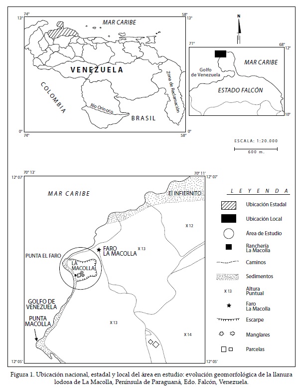 La llanura de La Macolla se ubica en la costa noroccidental de la Península de Paraguaná en las coordenadas 12° 05'31" N, y 70° 11' 59" W, al SW del faro del mismo nombre (Figura 1). El clima del área es semiárido (Cuadro 1), por consiguiente la vegetación se circunscribe a las especies xerofíticas y puntualmente halófitas en los sectores cenagosos.