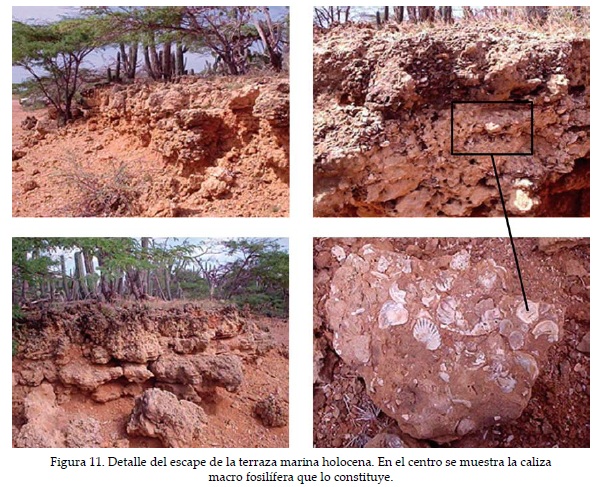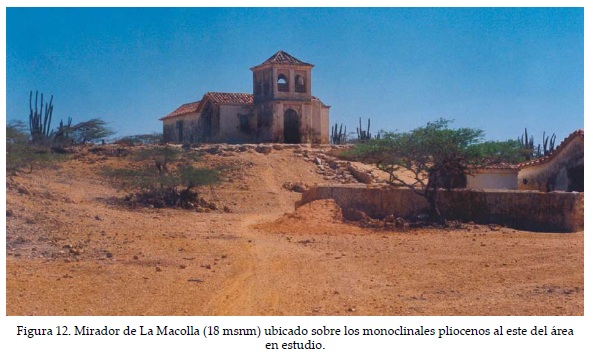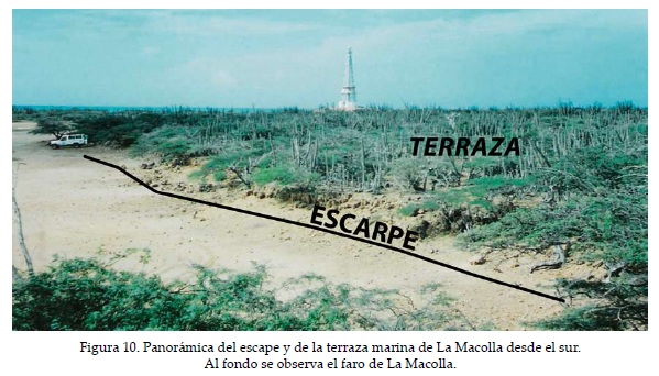La charca costera de La Macolla como la de nominaría Martínez (1986), está delimitada por la terraza marina mencionada, con un escarpe de 80 cm en promedio en el extremo E, constituida por calizas macro fosilíferas (Figuras 10 y 11), que decrecen hacia los laterales y se prolongan hacia la costa donde son sepultadas por los depósitos de barrera (Figura 4) o son erosionados por el oleaje, además la terraza seadosa al pie del frente de los monoclinales con buzamientos entre 5 y 8° de la Formación Paraguaná del Plioceno, conformado por calizas y lutitas (MEM, 1997). Estos relieves estructurales circundan el área en estudio y en el flanco E se ubica el mirador de La Macolla, mientras que sobre el flanco N se ubica el faro del mismo nombre (Figura 10 y 12).