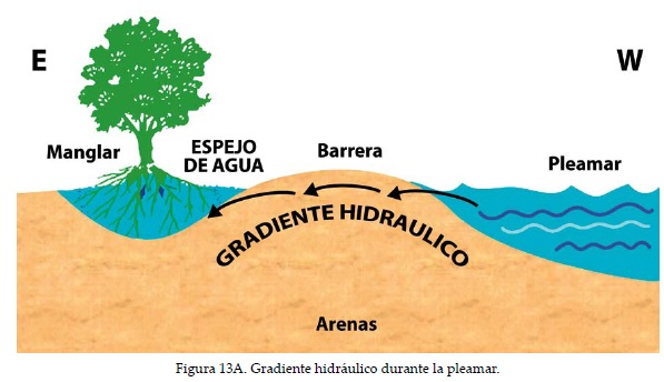 El primero se reconoce como factor responsable de la migración hacia el continente y el aumento en altura que mantiene emergida la barrera o cordón litoral. Durante los períodos de tormenta estas formas topográficas pueden quedar parcial o totalmente sumergidas de manera que el oleaje y las corrientes socavan material del frente de la barrera y lo transportan distribuyéndolo a lo largo del tope de la misma, lo que aumenta su elevación y progradación hacia tierra. Este efecto combinado aumenta las dimensiones de esta forma topográfica como ha sido demostrado por Godfrey y Godfrey (1973), en Core Banks, North Carolina, la situación está gráficamente documentada en Komar (1998). Igualmente, Curray et al. (en De la Lanza, 1996, Komar 1998), interpretan la evolución geomorfológica de la planicie costera de Nayarit, México, asociada a la transgresión holocénica dentro de la cual se produjeron períodos transgresivos y regresivos depositacionales, conformándose cordones que migraron a lo largo de la costa por el transporte litoral, aislando lagunas, generándose condiciones propicias para que se asentaran comunidades de manglar.