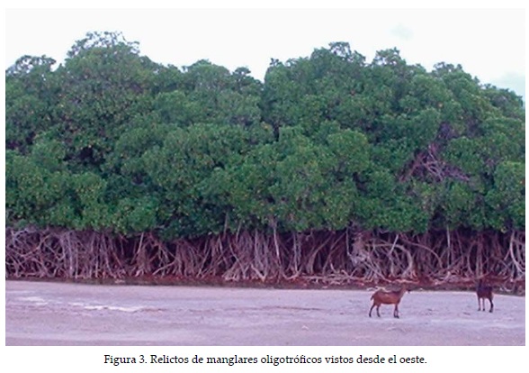 Lo expuesto indica que estamos ante una situación remanente de una etapa inicial de evolución donde esta vegetación era más extendida, como lo demuestran los restos de tallos de manglares secos en el interior de la planicie lodosa. Esta vegetación debió ocupar el antiguo borde costero, antes de la completa construcción de la barrera por los mecanismos de transporte litoral, los cuales terminaron por cerrar lo que probablemente funcionó, en principio, como bahía influenciada directamente por las mareas, y luego como laguna costera. Como es conocido, el Rizophora mangle ocupa el lugar más próximo a la costa y las raíces adventicias constituyen, entre otros, un mecanismo de adaptación a los embates del oleaje. Además, las raíces neumatóforas del Avicennia germinans pueden provocar, de acuerdo con el patrón de circulación establecido, una sedimentación de materiales orgánicos e inorgánicos suspendidos en el agua generándose así un suelo de textura fina que favorece el poblamiento de nuevas plantas y la extensión de la especie pionera en las áreas intermareales.