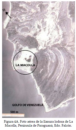 De 2003 a 2004 se realizaron seis trabajos de campo para recolectar las muestras de los diferentes ambientes sedimentarios que constituyen el área de la llanura de La Macolla y para realizar la interpretación y los ajustes pertinentes. La fotointerpretación (Figura 4) se llevó a cabo a partir de las fotografías aéreas pancromáticas (Figura 4A), misión 0201127 N° 878-879-880 a escala 1: 25 000 de diciembre de 1997 de Cartografía Nacional Ministerio del Ambiente y los Recursos Naturales Renovables. Se decidió trabajar con esta misión porque el vuelo disponible más reciente se realizó en 1984 a escala 1: 80 000, lo cual dificulta la visión estereoscópica para un área tan puntual como la desarrollada en esta investigación. Los mapas empleados fueron Hoja 6152-II NO Edición II, 1990 Guaimú a escala 1: 25 000 y Hoja 6152, Edición 1DCN, 1962 Punta Macolla a escala 1:100 000.