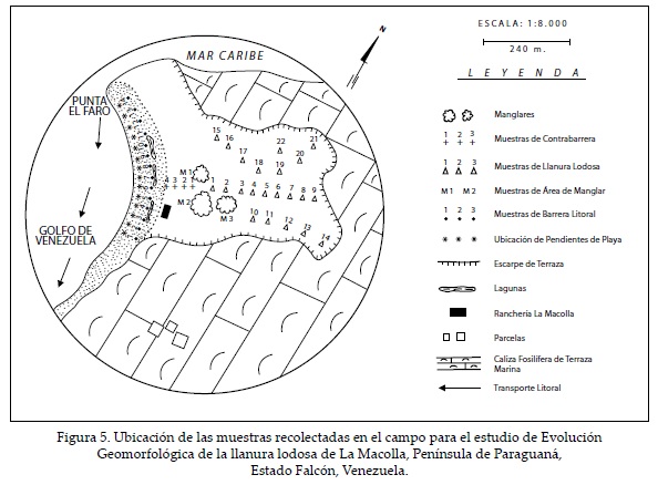 En cada trabajo se ejecutaron sistemáticamente seis transectos base: tres en la planicie lodosa, uno en los manglares, uno en la transición manglar-barrera y uno a lo largo de la barrera litoral en el sector de supraplaya (Figura 5), obteniéndose un total de 43 muestras superficiales tomadas de 20 a 40 cm de profundidad que se llevaron a laboratorio para ser analizadas.