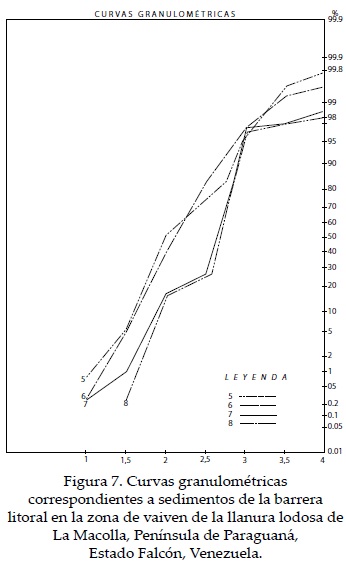 En el caso de las muestras de la barrera litoral y la zona de transición ubicada en la cara externa de los manglares que miran hacia la playa, por ser evidentemente arenosas al tacto, se les aplicó el tamizado en seco con la secuencia de tamices Nº 35 (0.50 mm, 1.0 Ø), Nº 45 (0.35 mm, 1.5 Ø), Nº 60 (0.25 mm, 2.0 Ø), Nº 80 (0.117 mm, 2.5 Ø), Nº 120 (0.125 mm, 3.0 Ø), 170 (0.088 mm, 3.5 Ø), Nº 230 (0.0625 mm, > a 4 0). Apartir de los pesos obtenidos en cada tamiz se calculó el porcentaje de peso acumulado mediante la utilización del programa de computación Grain Program, lo cual facilitó el procesamiento de los datos. Los pesos acumulativos sirvieron de base para trazar las curvas granulométricas o curvas de frecuencia acumulada en papel de probabilidad (Figuras 6 y 7). Así se ilustró la distribución por tamaño del sedimento que permitió determinar los diámetros Ø (phi) para los percentiles 5, 16, 25, 50, 75, 84, y 95, los cuales forman parte de las medidas sugeridas por Folk y Ward (1957), King (1975) expresadas por los parámetros estadísticos que caracterizaron los sedimentos > a 0.0625 mm, como son: tamaño promedio de la partícula, selección o escogimiento, asimetría y curtosis. En esta parte del proceso se utilizó una hoja de cálculo diseñada en el programa Excel para tal fin.
