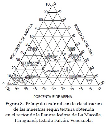 Las características sedimentológicas de este ambiente se definen a partir del Cuadro 2 y Figura 8, donde se aprecia la ubicación de los resultados hacia la parte central y derecha del triángulo que corresponde al predominio textural de equilibrado limoso, equilibrado arcilloso, equilibrado con arcilla limosa y, finalmente, en menor cuantía, textura arcillosa y equilibrada pura, lo cual confirma la presunción inicial de la naturaleza fina de los materiales que constituyen el área y explica la presencia de los polígonos de contracción. Al considerar que el nivel marino cubrió esta bahía en el último interglacial (Audemard, 1996) y que el retiro fue progresivo, se puede postular que para el Holoceno medio, esta área funcionaba como una escotadura en el litoral y debió estar directamente influenciada por las mareas cuyos sedimentos finos contribuyeron a colmatarla además de la sedimentación que se generó en la laguna costera al ir quedando progresivamente aislada por efecto del crecimiento de la barrera. Otro factor que también debe tomarse en cuenta para explicar la sedimentación fina en la planicielodosa es la indicativa de unas condiciones de mayor humedad en el pasado reciente, las cuales permitieron la meteorización de las calizas fosilíferas que conforman la terraza marina circundante y los monoclinales ligeramente más elevados que bordean la misma. El desarrollo de la morfología kárstica producto de la disolución de las calizas, tan extendida en el área, apoyan esta posibilidad. No obstante, aun en las condiciones climáticas actuales, las regiones de clima BSh como la estudiada suelen presentar lluvias esporádicas de corta duración, distanciadas en el tiempo, sin ninguna regularidad pero de carácter torrencial (Vareschi, 1992), lo cual genera una gran agresividad morfogenética traducida en un arrastre considerable de sedimentos.