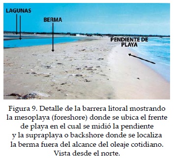 En la barrera litoral se registró la pendiente de playa en sentido S-N, cada 40 m, siguiendo el método de Blong (1972), que cubre una longitud de 465 m. Las mediciones se hicieron en la mesoplaya o playa emergida (foreshore), dentro de la cual se ubica el frente de playa o beach face, en línea recta desde la berma hasta el vaivén, siguiendo la terminología propuesta por Carranza y Caso (1994). Se trata de una superficie inclinada hacia el mar, donde el límite inferior se corresponde con la zona de vaivén, o lavado (swash) y relavado (backwash), determinada por el máximo avance y retroceso del flujo laminar (Figura 9). En este caso, la parte superior está ocupada por la cresta de berma, aun cuando en algunos lugares puede estar ausente.