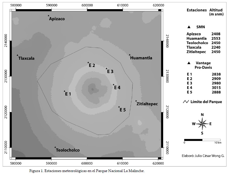 Se seleccionaron cinco estaciones meteorológicas correspondientes al Servicio Meteorológico Nacional (SMN) cercanas al Parque (Tlaxcala, Apizaco, Huamantla, Teolocholco y Zitlaltepec), de las cuales se analizó la temperatura y precipitación mensual y diaria para el período de septiembre 2003 a mayo 2004 (SMN, 2000). Asimismo, se analizaron las variables temperatura y humedad relativa mensual y diaria de cinco estaciones automáticas Vantage Pro-Davis (Figura 1), que fueron instaladas aproximadamente a una altitud de 3 000 msnm en diferentes laderas del volcán (Villers, 2001).