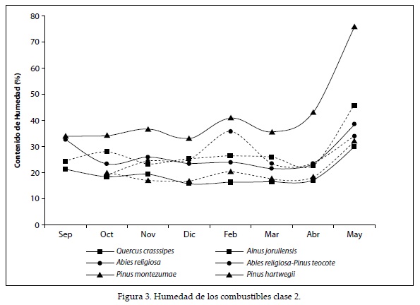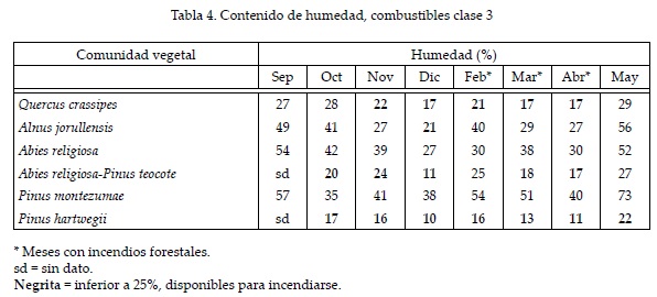 Tomando en cuenta que el porcentaje de humedad de los combustibles al que pueden arder es igual o menor al 25% (Porrero, 2001), se encontró que durante los meses de febrero, marzo y abril, cuando sucedieron los incendios, los combustibles de la clase 2 en las comunidades Quercus crassipes, Abies religiosa, A. religiosa-Pinus teocote y Pinus hartwegii, presentaron una humedad igual o menor del 25%, por lo que se encontraban disponibles para la combustión (Tabla 3). Estos porcentajes mínimos permanecieron en la mayoría de los meses con excepción de mayo. En las comunidades de Alnus jorullensis y Pinus montezumae la humedad de los combustibles fue mayor al 25%.