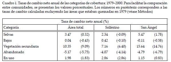 Aunque en ambas comunidades se dio un gran aumento neto en la cobertura de selvas, al excluir la transición de quema a selvas, la tasa de cambio de éstas fue ligeramente negativa en Solferino, lo cual indica que allí el uso del suelo favoreció ligeramente la deforestación, mientras que en San Ángel favoreció la regeneración de selvas (Cuadro 1). Lo anterior es un ejemplo claro de la utilidad de calcular las tasas de cambio de cobertura con base en las pérdidas (transiciones hacia otras categorías) y las ganancias (transiciones de otras categorías), dado que permite evaluar la contribución relativa de las diferentes categorías al cambio de cobertura analizado.