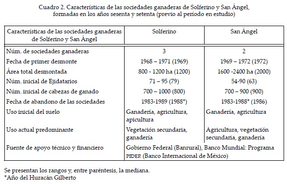 Durante los años sesenta y setenta en el área en estudio y en todo el país se implementaron programas gubernamentales de fomento a actividades agropecuarias, principalmente la ganadería, a través de créditos otorgados a sociedades formadas por campesinos y ejidatarios (Merino, 2004). El Cuadro 2 muestra algunas características de las sociedades ganaderas formadas en Solferino y San Ángel durante el período 1968-1972. Con base en las encuestas hechas a los ejidatarios, estos programas generaron la deforestación de un área aproximada de 800-1 200 ha en Solferino y 1600-2400 ha en San Ángel. Con base en la imagen satelital de 1976, se calcula que para entonces existía un área claramente deforestada de aproximadamente 760 ha en Solferino y 2 220 ha en San Ángel. Gran parte de este área se regeneró rápidamente, pues en la fotografía aérea de 1979 el área desmontada para el establecimiento de potreros ocupaba sólo unas 300 ha en Solferino y unas 400 ha en San Ángel (Figura 2A).