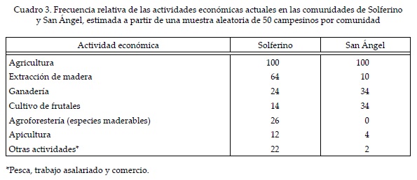 Actualmente, la agricultura (el cultivo de la milpa y en menor medida hortalizas) es la actividad productiva predominante y la practican todos los ejidatarios entrevistados en ambas comunidades (Cuadro 3). En Solferino le siguen en orden de importancia la extracción de madera y la agroforestería de especies maderables, principalmente cedro y caoba. En San Ángel no se reporta esta última actividad y en cambio tienen mayor importancia la ganadería y el cultivo de especies frutales (principalmente cítricos). Otras actividades, como la pesca y el trabajo asalariado, tienen mayor importancia en Solferino que en San Ángel (Cuadro 3).