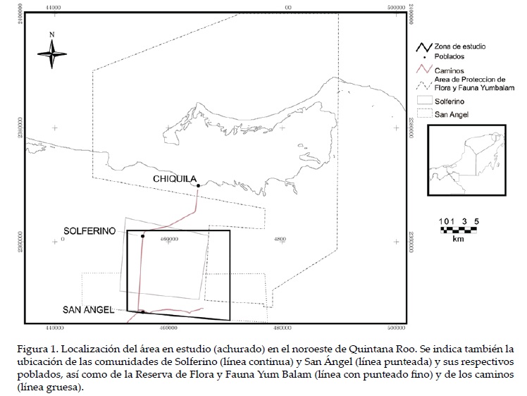 Como producto de actividades humanas que datan de por lo menos tres mil años, aunadas a perturbaciones naturales como huracanes, incendios y cambios climáticos (Schultz, 2001), el paisaje del área en estudio es un mosaico de selvas medianas subcaducifolias y subperennifolias de diferentes edades sucesionales, palmares, sabanas o pastizales inundables y zonas abiertas dedicadas a actividades agropecuarias (Olmsted et al., 2000). Las comunidades de estudio son parte del municipio Lázaro Cárdenas (3881 km2), considerado el más pobre del estado (Secretaría de Gobernación, 1988), caracterizado por su baja densidad poblacional (5.0 hab/km2) y su carácter rural. El 74% de los habitantes es de origen indígena, en su mayoría mayas (93%); (INEGI, 1994; 2000). Las comunidades de San Ángel (797 pobladores) y Solferino (762) conforman el 36% de la población del municipio (INEGI, 2000). El 71% del área del municipio es del de propiedad comunal, 20% de propiedad particular y 9% de propiedad nacional (Lazcano-Barrero et al., 1995). Ambas comunidades se encuentran en la zona de amortiguamiento del Área de Protección de Flora y Fauna Yum Balam, decretada el 6 de junio de 1994 (DOF, 1994).