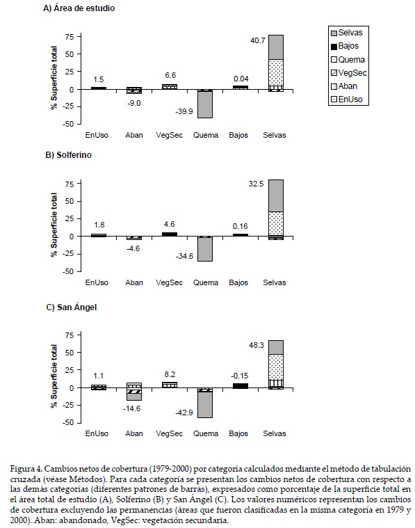 En 1979 las categorías de cobertura predominantes fueron las de quema (11089 ha, 40% del área total en estudio) y selvas (10832 ha, 39%; Figura 3A). Las categorías en uso (797 ha) y abandonado (3722 ha), juntas representaron 16% del área total, mientras que la vegetación secundaria representó menos del 1% (266 ha). Para el 2000, la cobertura de selvas se duplicó alcanzando 22167 ha (80% del área total), debido en gran parte a la regeneración de quemas categoría que no se registró en ese año. En este lapso de tiempo, la cobertura de vegetación secundaria aumentó casi ocho veces, pasando a ser la segunda categoría en importancia (2103 ha, 8% del área total). Los terrenos en uso también aumentaron ligeramente (a 1203 ha, 4% del área total), mientras que los terrenos abandonados se redujeron a un tercio de su cobertura inicial (1221 ha, 4% del área total; Figura 3A).
